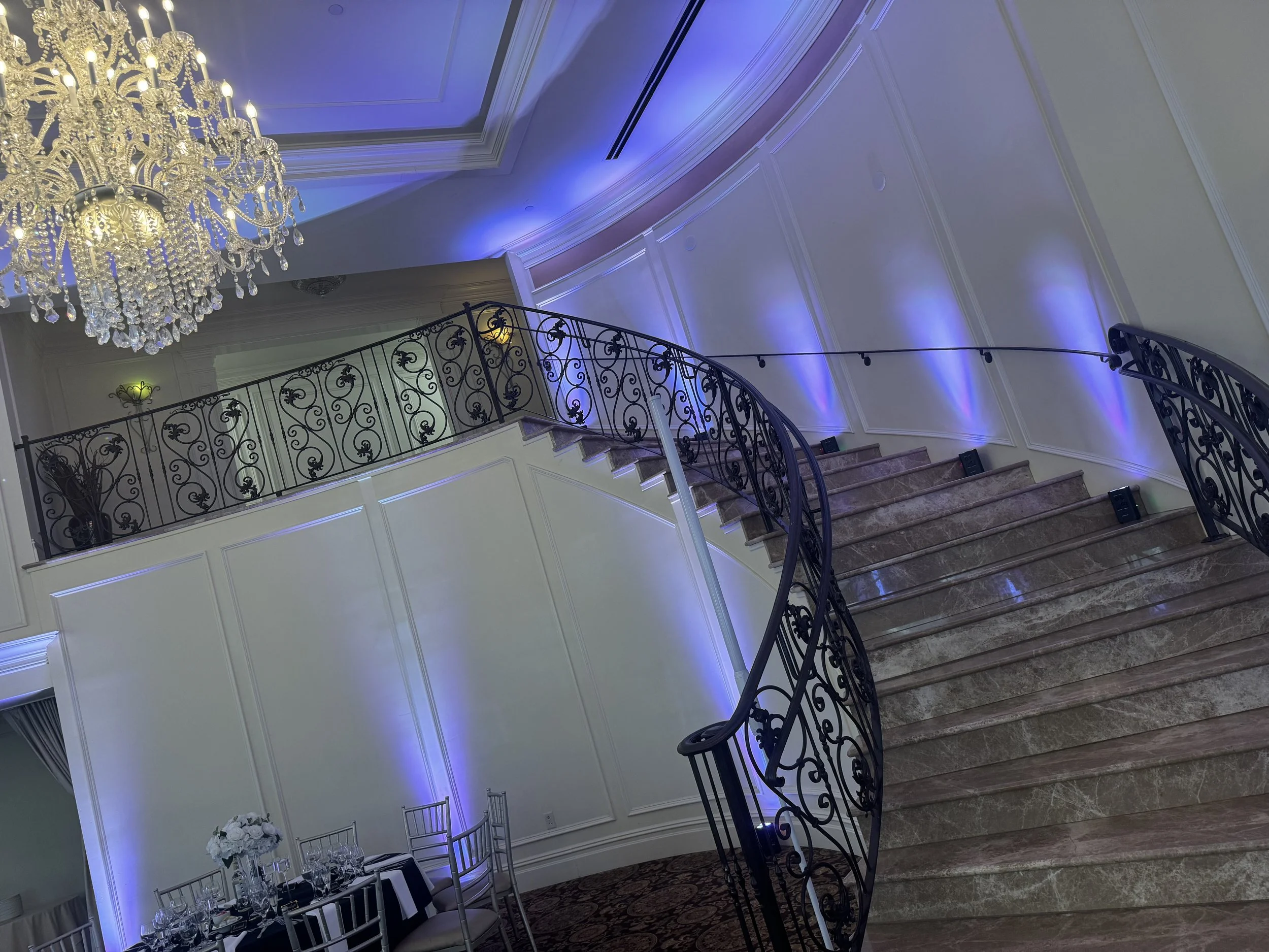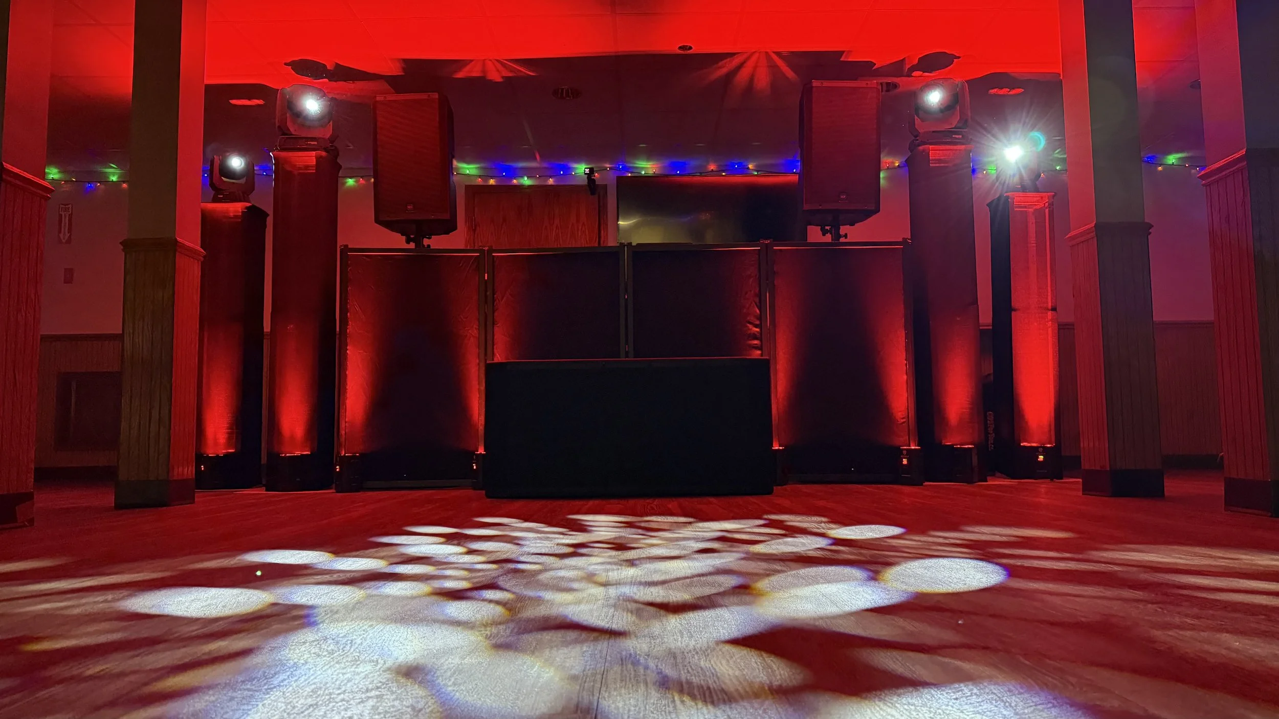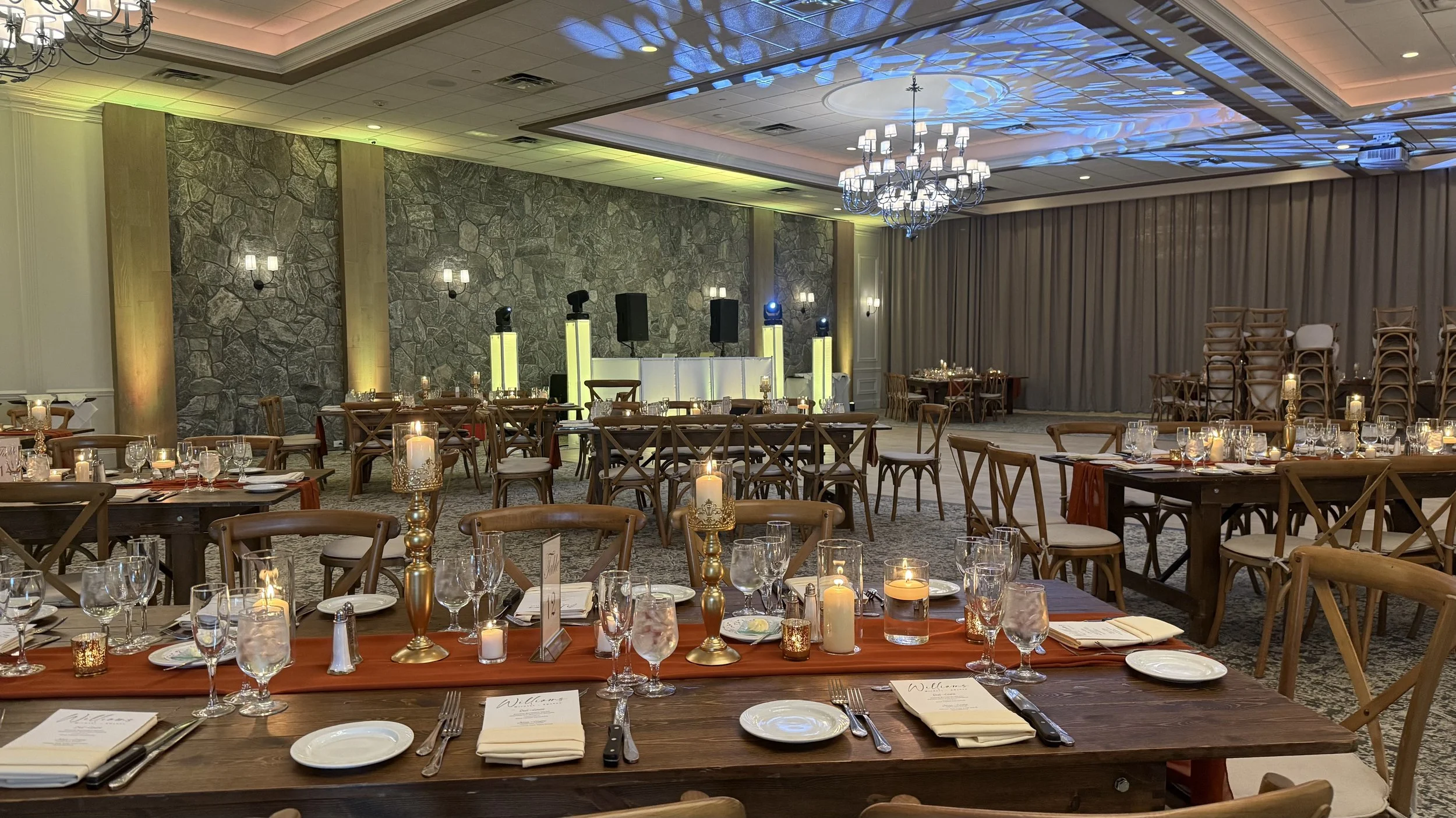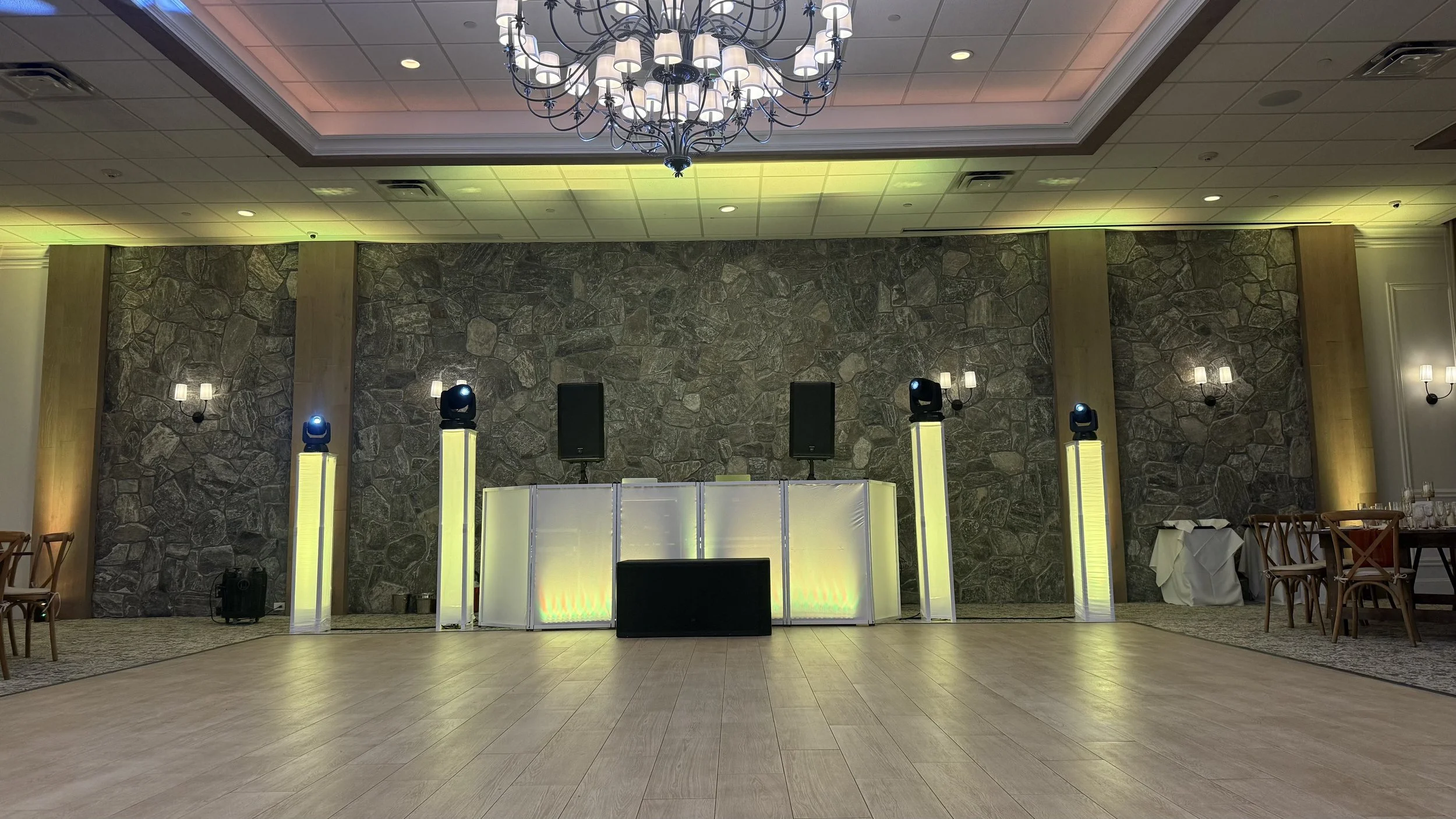 Dynamic moving lights, color washes, strobes, and programmed scenes that react to the music and the mood of the night. Focused spotlights lock attention on key moments — the first kiss, speeches, cake cutting — while full-floor lighting converts the reception into a club-quality dance experience.