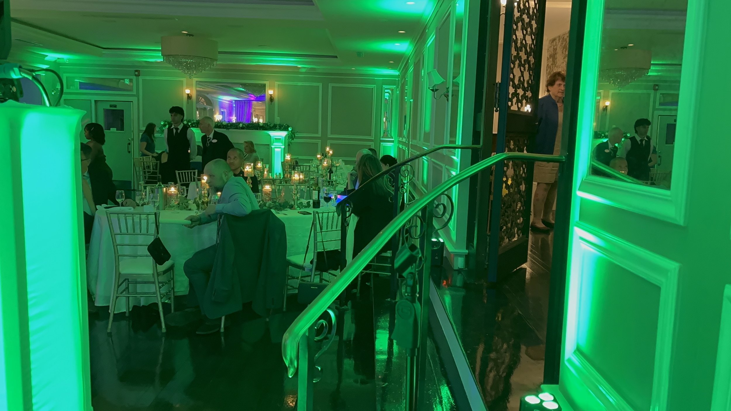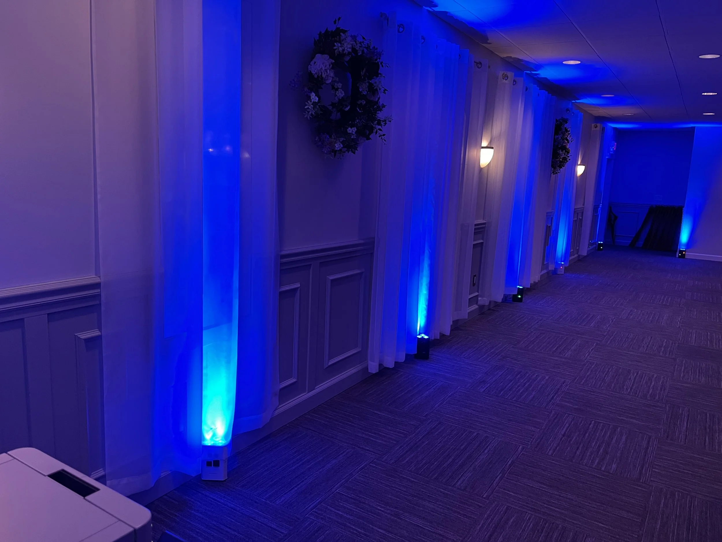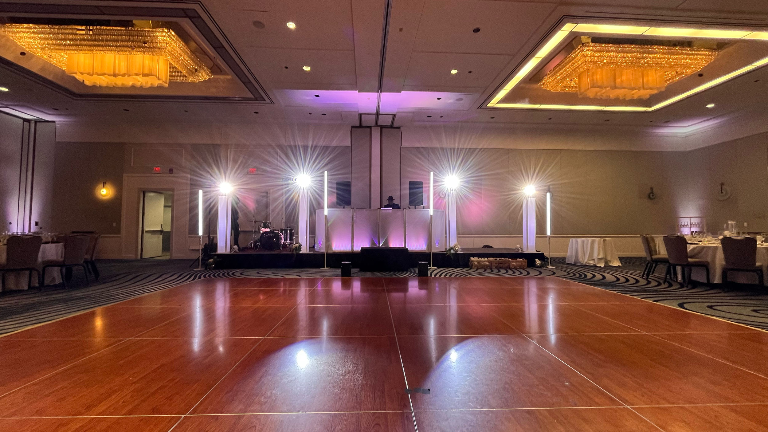Dynamic moving lights, color washes, strobes, and programmed scenes that react to the music and the mood of the night. Focused spotlights lock attention on key moments — the first kiss, speeches, cake cutting — while full-floor lighting converts the reception into a club-quality dance experience.