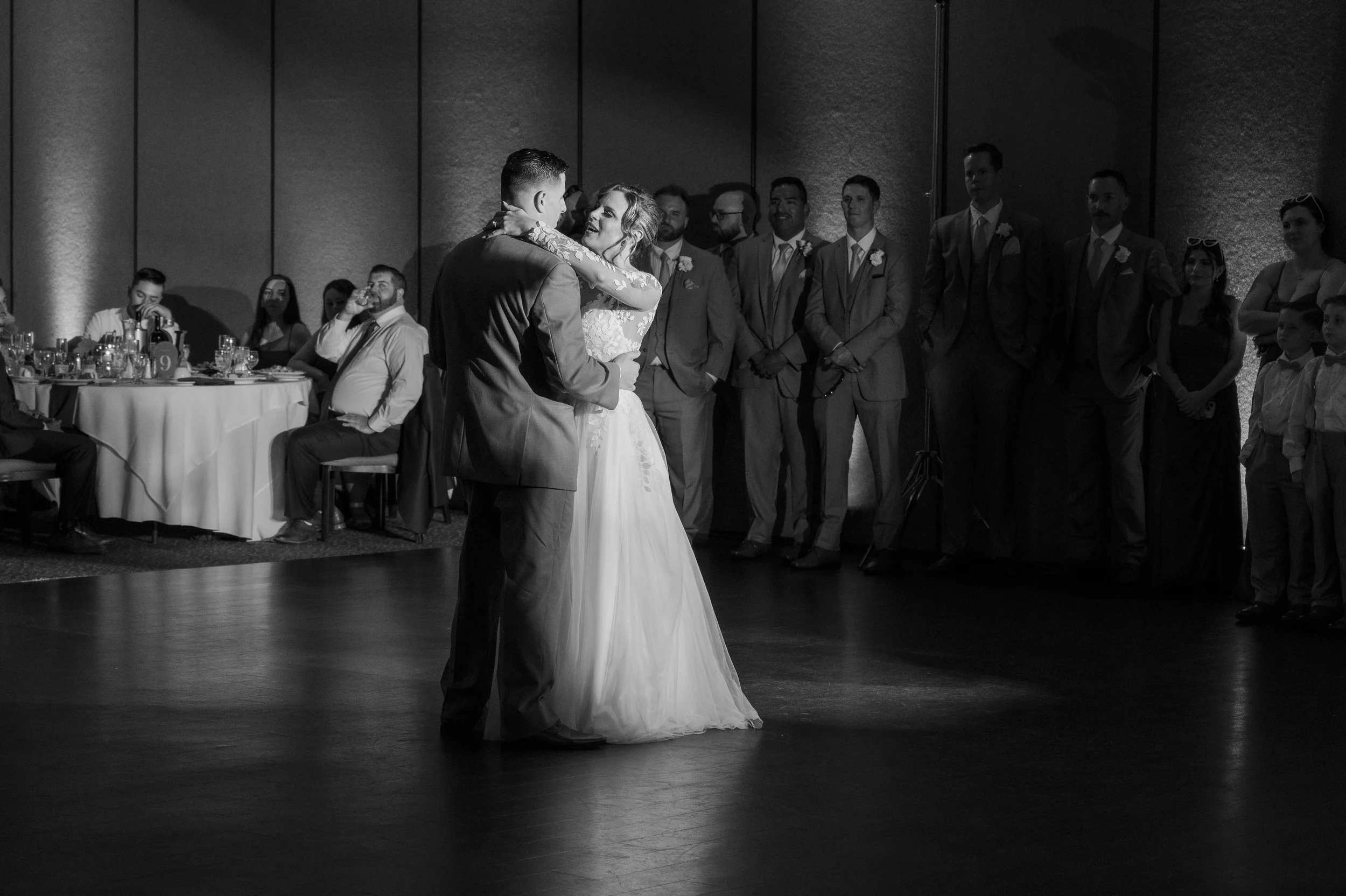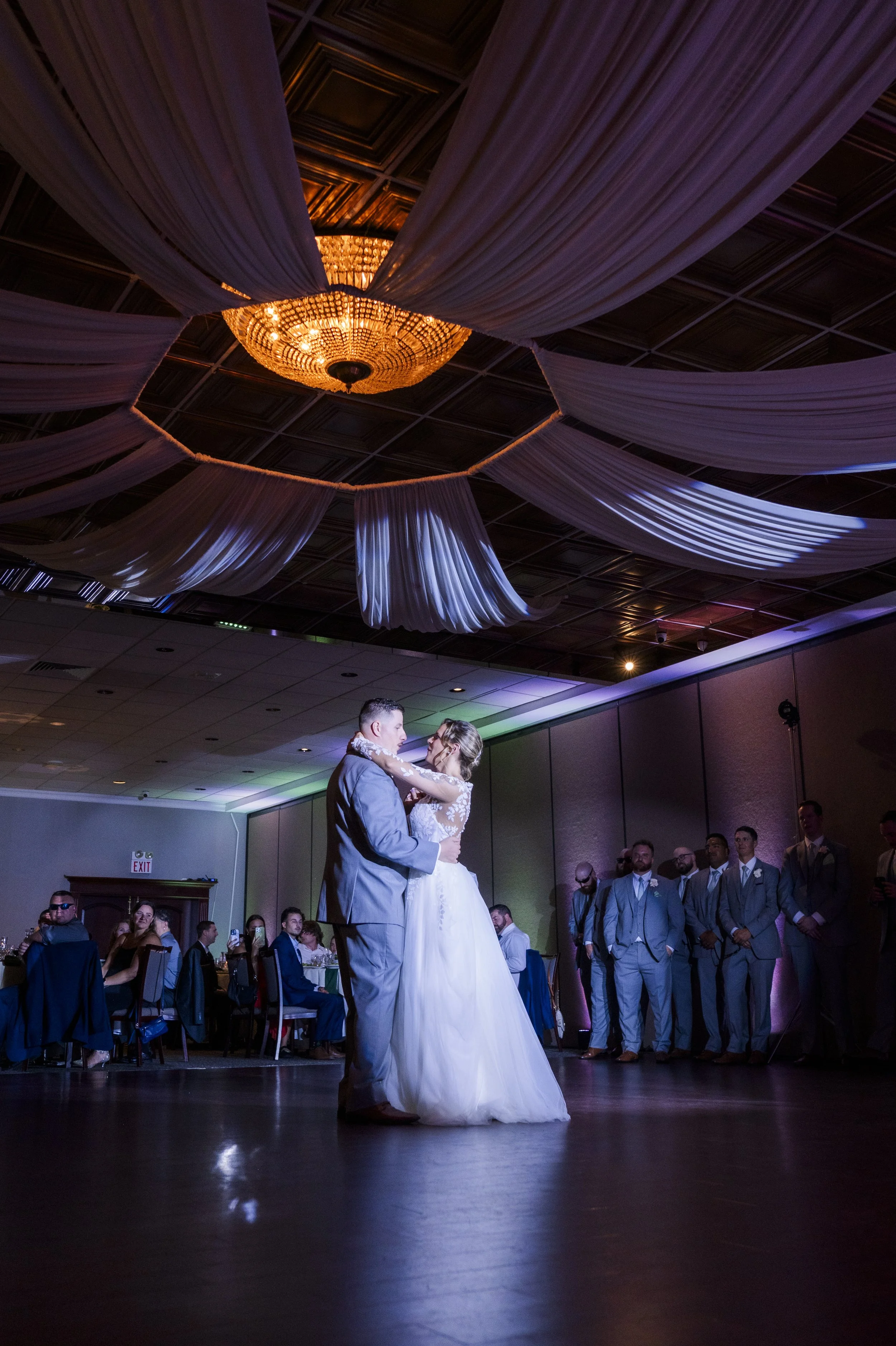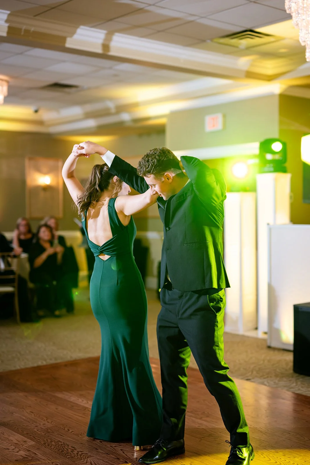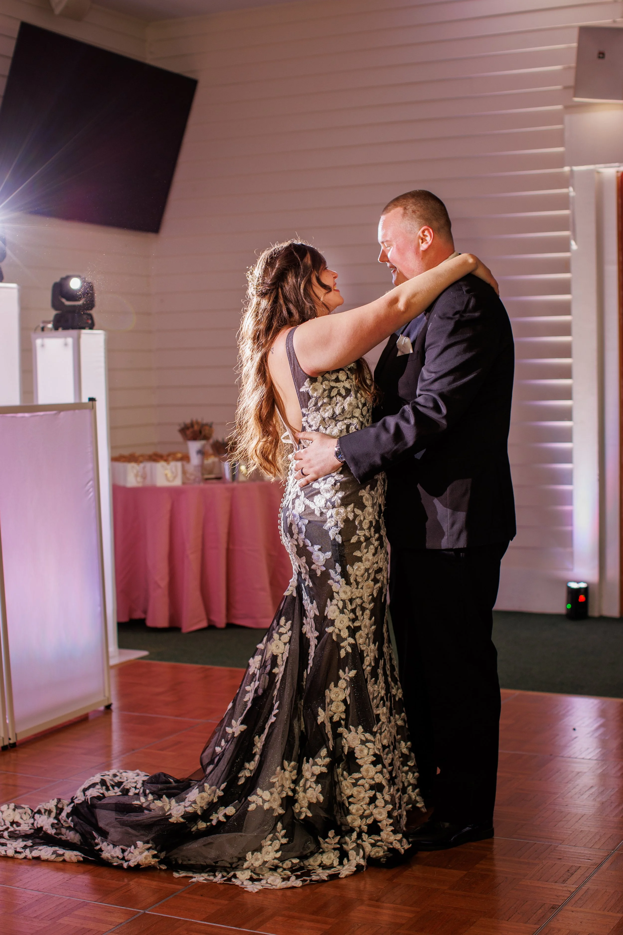 Dynamic moving lights, color washes, strobes, and programmed scenes that react to the music and the mood of the night. Focused spotlights lock attention on key moments — the first kiss, speeches, cake cutting — while full-floor lighting converts the reception into a club-quality dance experience.